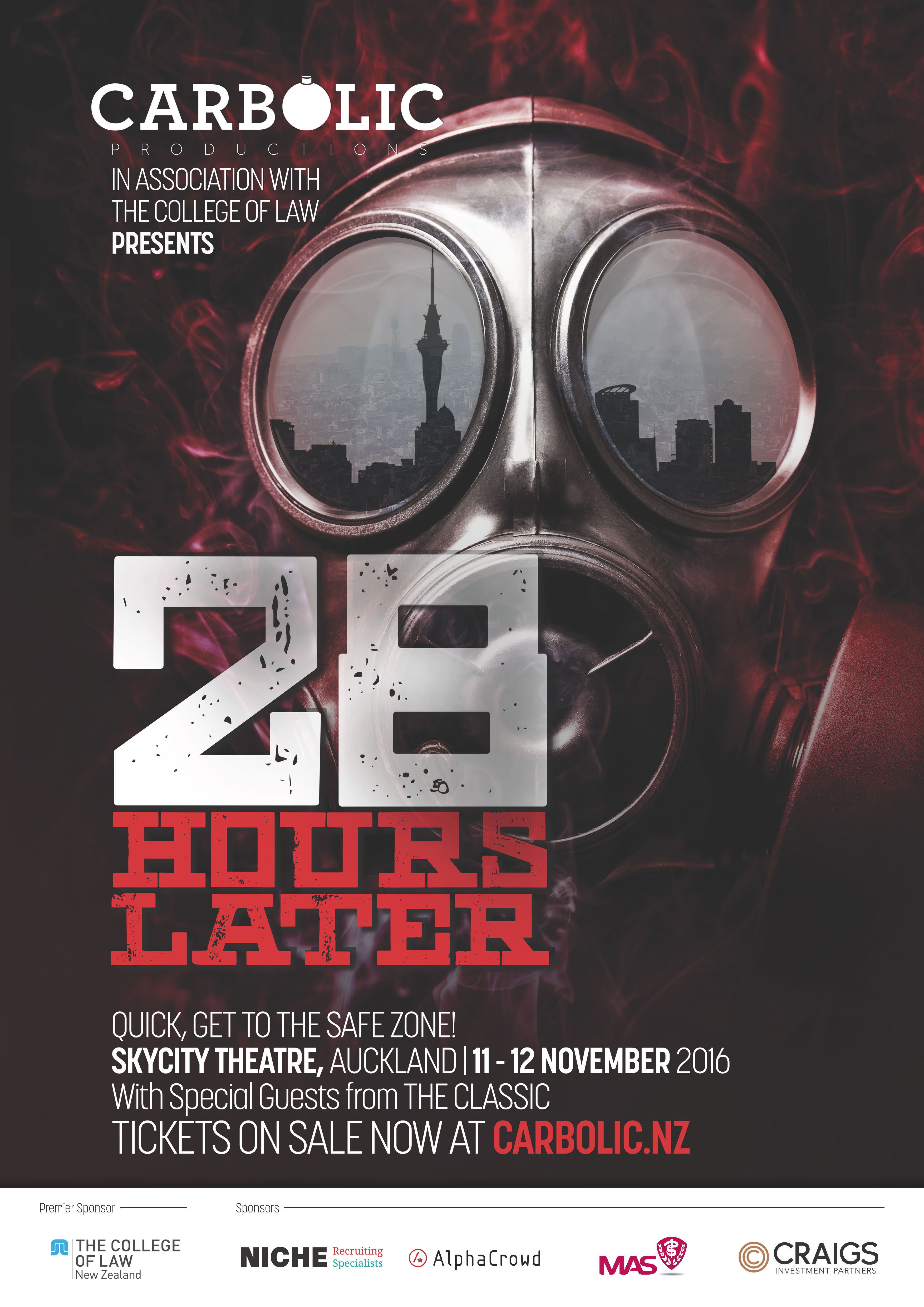 Donald John Trump has just been voted the 45th president of the United States of America. 28 hours later a group of friends return to a deserted Auckland from a camping trip. Discovering the world has fallen to a mysterious virus, our survivors race against the clock to find the cure before they too are infected. Make sure you get to the SKYCITY safe zone in time to join our survivors in a post-apocalyptic comedic thriller as they battle zombies, soldiers, mad scientists, armed with plenty of sass and an endless supply of snacks.